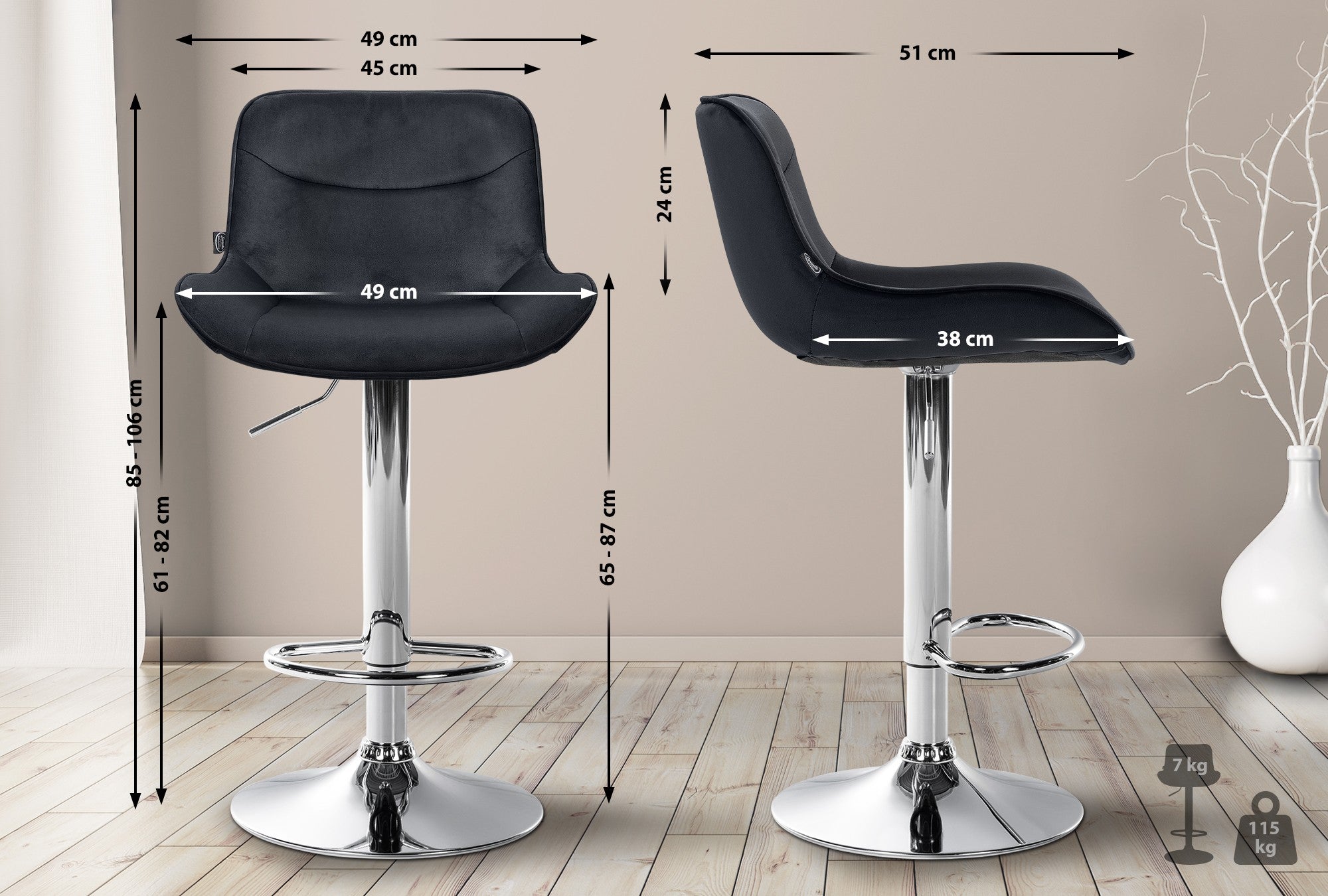 La structure en métal et le piètement en trompette garantissent stabilité et durabilité. Le repose-pieds intégré s'ajuste à la hauteur de l'assise et offre un soutien supplémentaire. Le revêtement en velours confère au tabouret de bar une allure élégante et une assise confortable. Les patins de protection protègent le sol des rayures.
