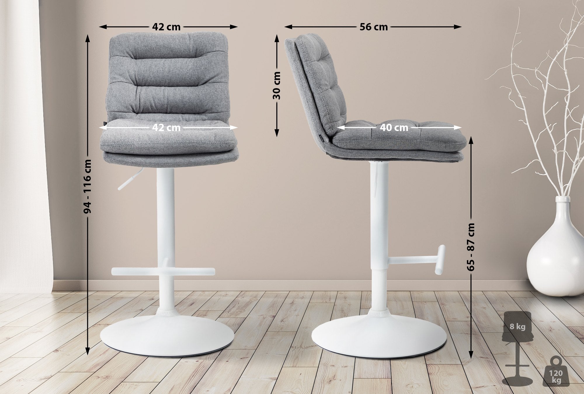 La structure et le revêtement tendance lui confèrent une allure élégante. L'assise est recouverte d'un tissu résistant. La structure métallique est réglable en hauteur et la fonction pivotante à 360 degrés assure une grande liberté de mouvement.