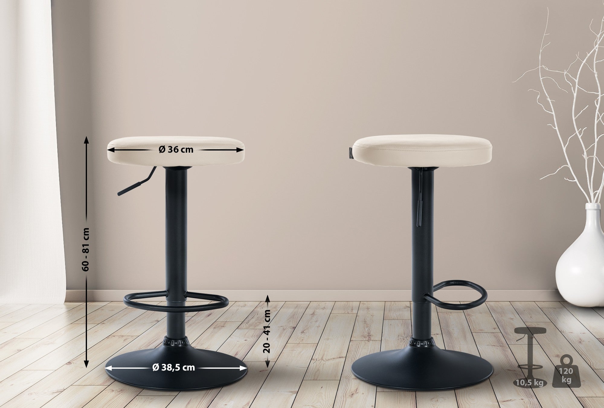 Assise réglable en hauteur de 60 à 81 cm, qui s'adapte facilement à vos besoins. La rotation à 360 degrés vous permet un mouvement sans restriction tout en étant assis confortablement et avec style.