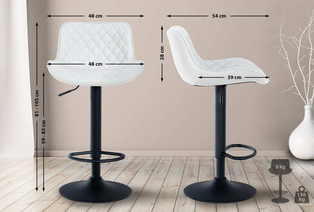 Grâce au vérin à gas prévu dans la colonne de la structure, ces tabourets de bar sont réglables en hauteur.