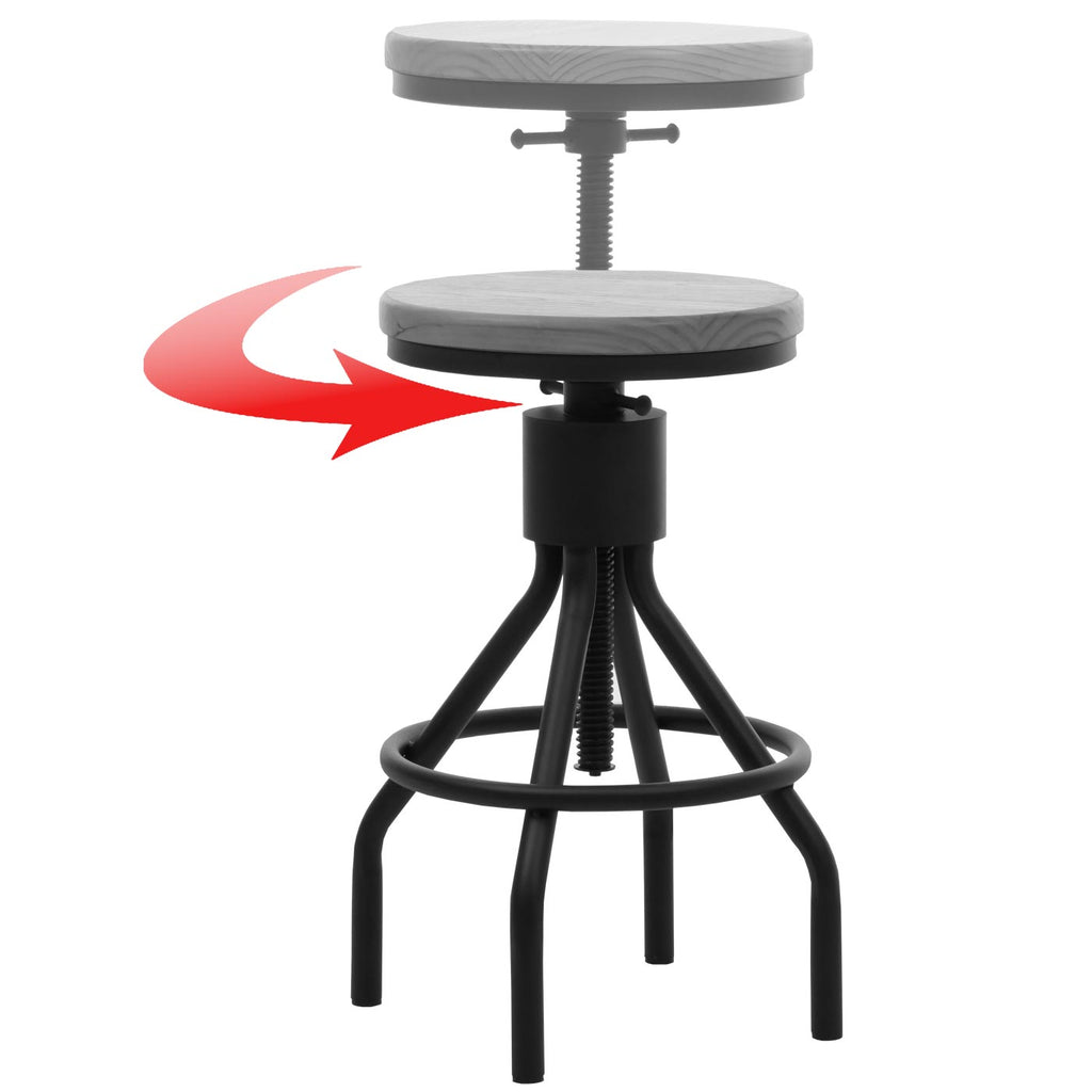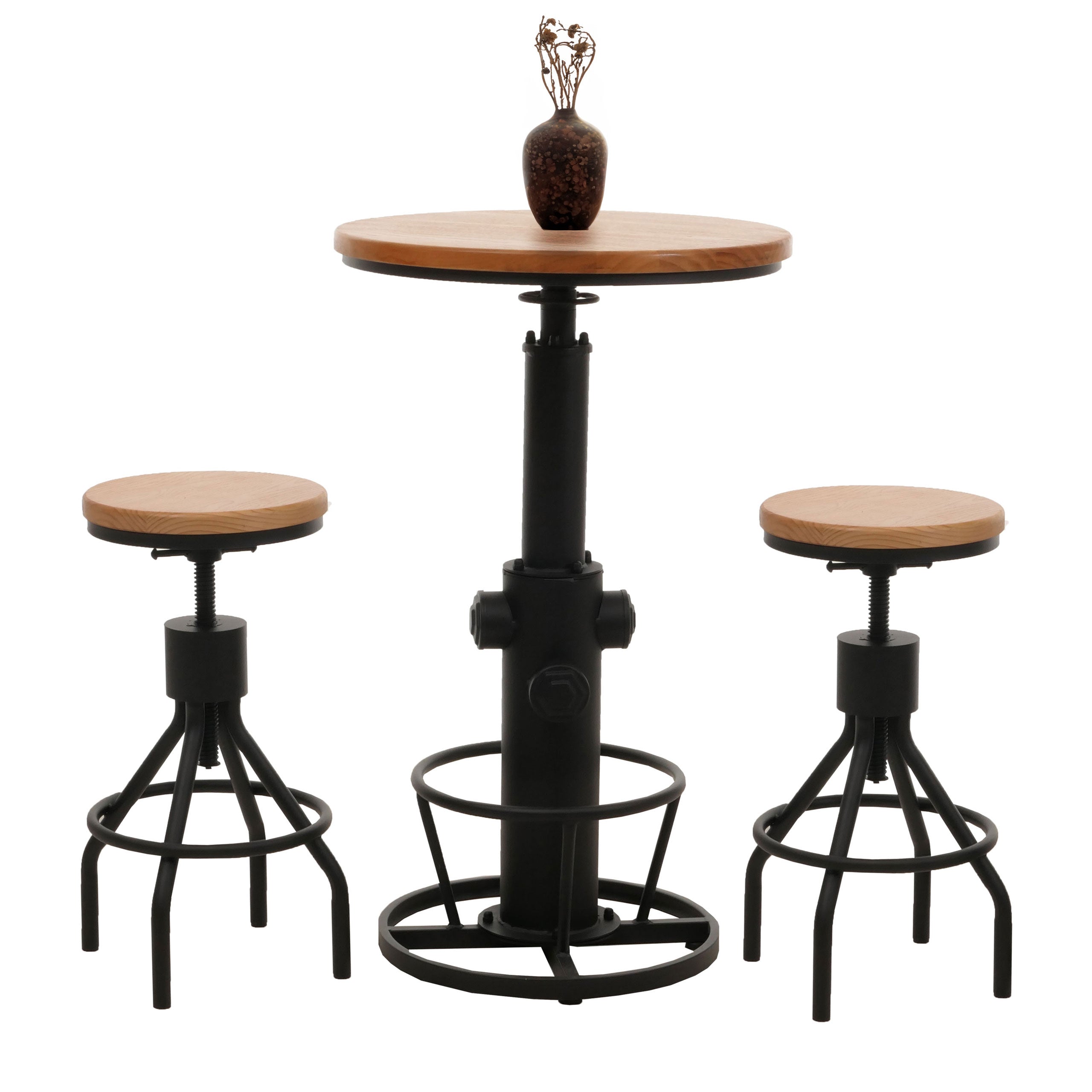 L'ensemble de bar comprend une table rotative à 360° et deux tabourets de bar rotatifs - réglables en hauteur en continu. La structure en métal robuste offre une sécurité, tandis que le siège et le plateau de table en bois assurent un look attrayant.