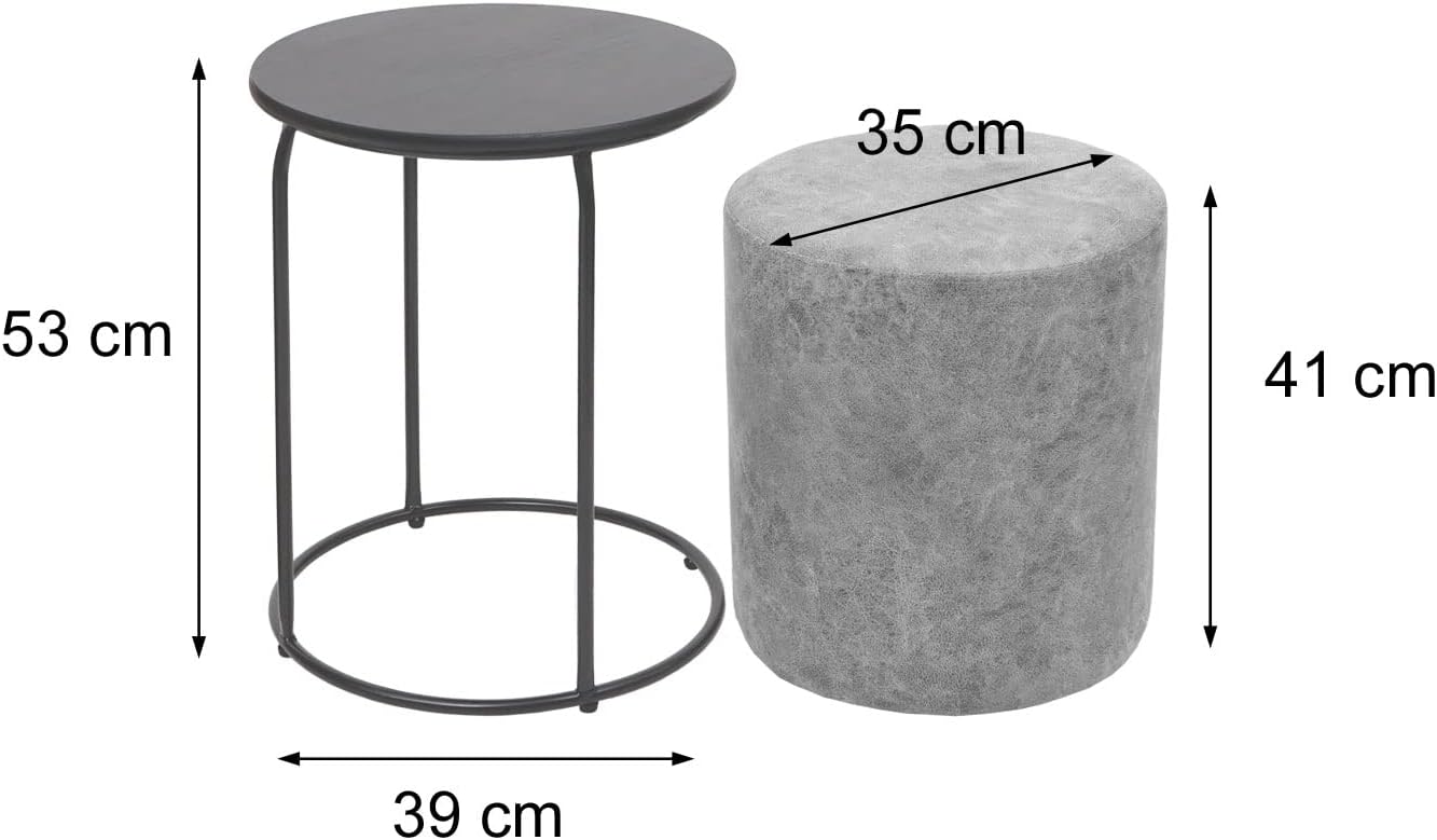 La table d'appoint avec structure en fer et plateau en MDF offre de la place pour des boissons, des collations ou des petits objets. Le pouf en similicuir facile d'entretien est un siège ou un repose-pieds confortable et peut être rangé sous la table pour gagner de la place.
