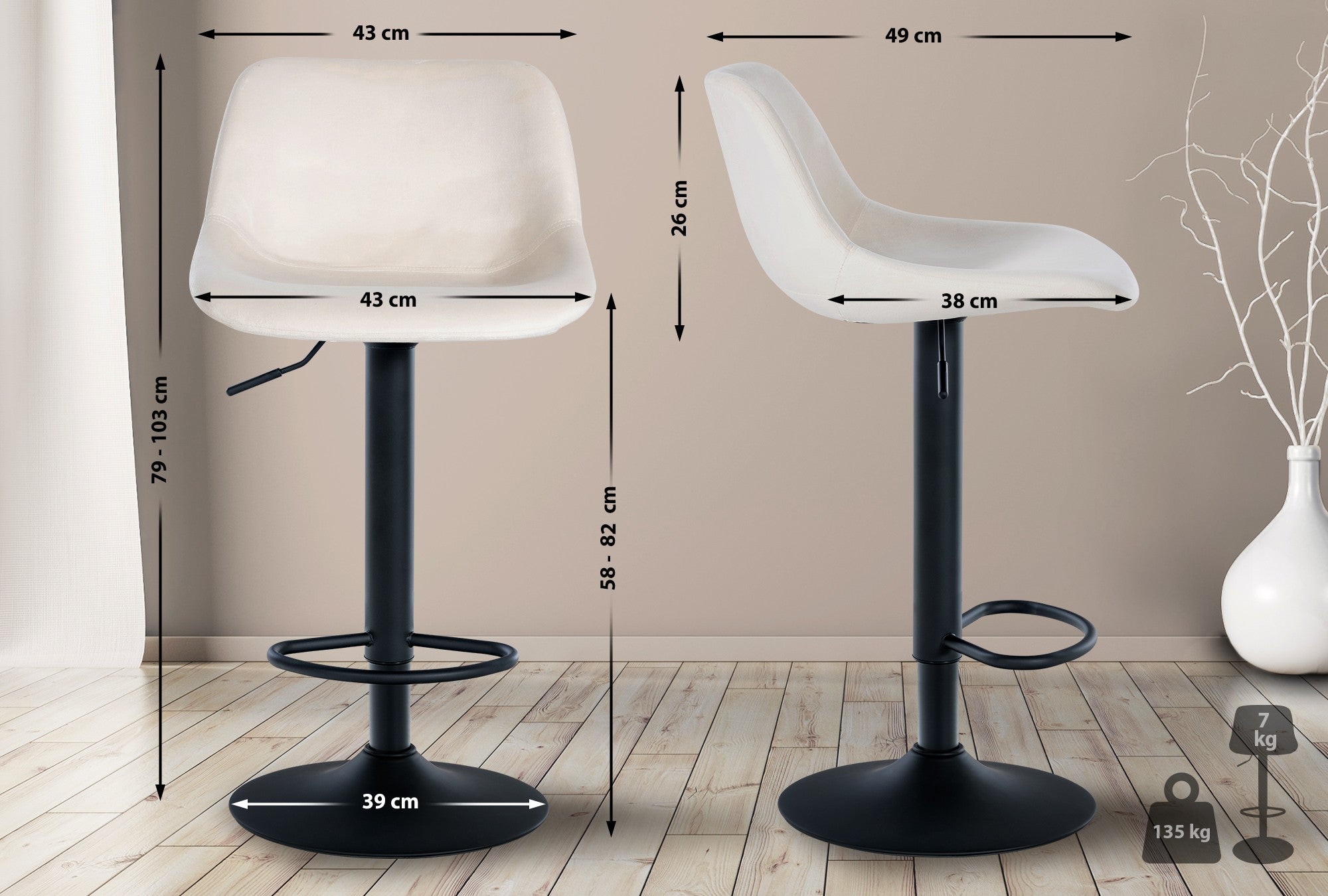 Les pieds en trompette permettent une rotation à 360°. Ils sont également équipés d'un repose-pieds, garantissant une assise confortable même pendant de longues périodes. Les cadres en métal noir sont réglables en hauteur et offrent un maintien sûr. Français Le cadre est également équipé de protections de sol pour éviter de rayer les sols.