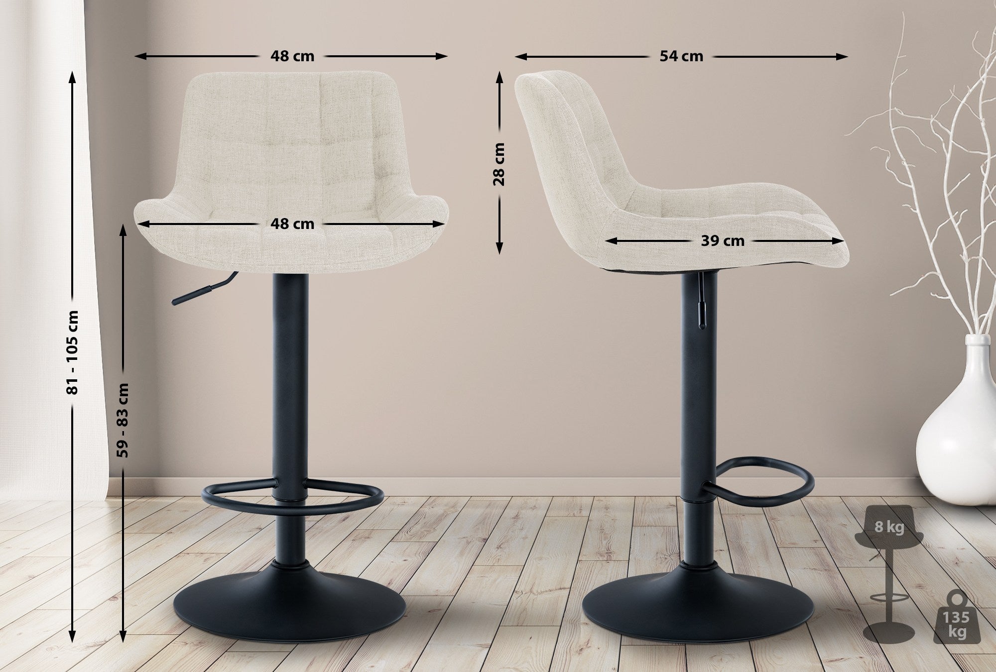 Grâce à sa structure en métal, le tabouret pivote à 360° et est réglable en hauteur, permettant ainsi de l'adapter individuellement aux besoins de l'utilisateur. La base robuste avec repose-pieds et patins assure une stabilité supplémentaire et une assise confortable, même pendant de longues périodes.
