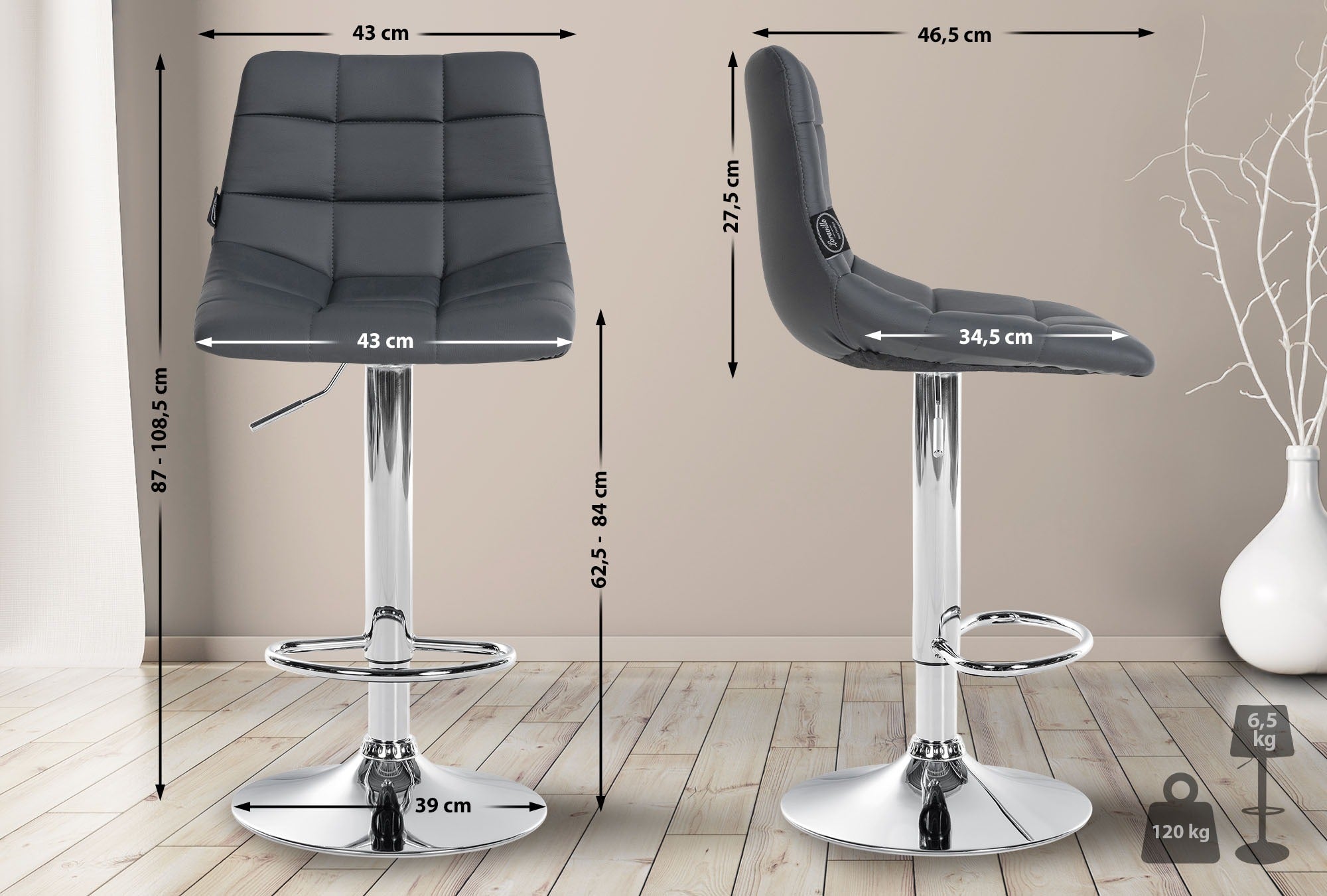 L'élégant tabouret de bar en similicuir séduit par son piètement en trompette réglable et son repose-pieds assorti, pour une assise confortable. La hauteur du tabouret s'ajuste facilement et rapidement à vos besoins, garantissant un ajustement parfait à votre table ou à votre comptoir. Le tabouret de bar pivote également à 360°, vous permettant de bouger librement.