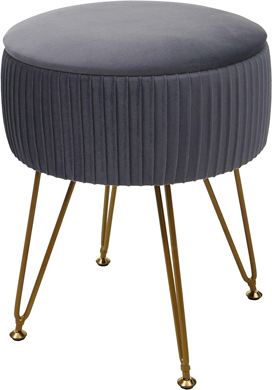 Tabouret avec compartiment de rangement Ø 33cm aspect velours gris clair cadre or TABO04012