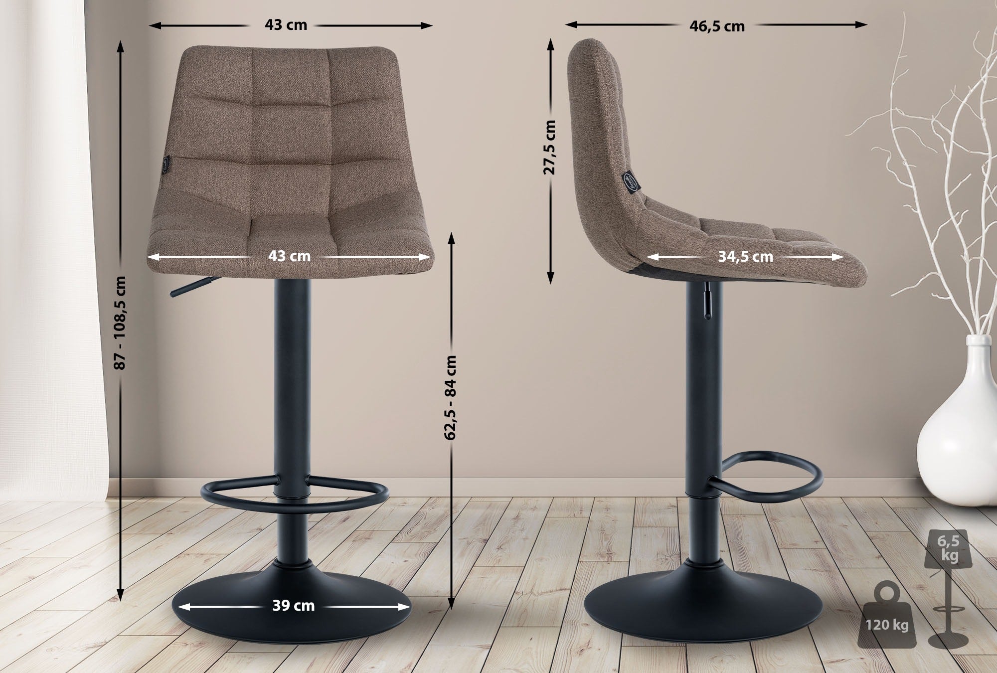 L'élégant tabouret de bar en tissu impressionne par son piètement en trompette réglable et son repose-pieds assorti, garantissant une assise confortable. La hauteur du tabouret s'ajuste facilement et rapidement à vos besoins, garantissant un ajustement parfait à votre table ou à votre comptoir. Le tabouret de bar pivote également à 360°, vous permettant de bouger librement.
