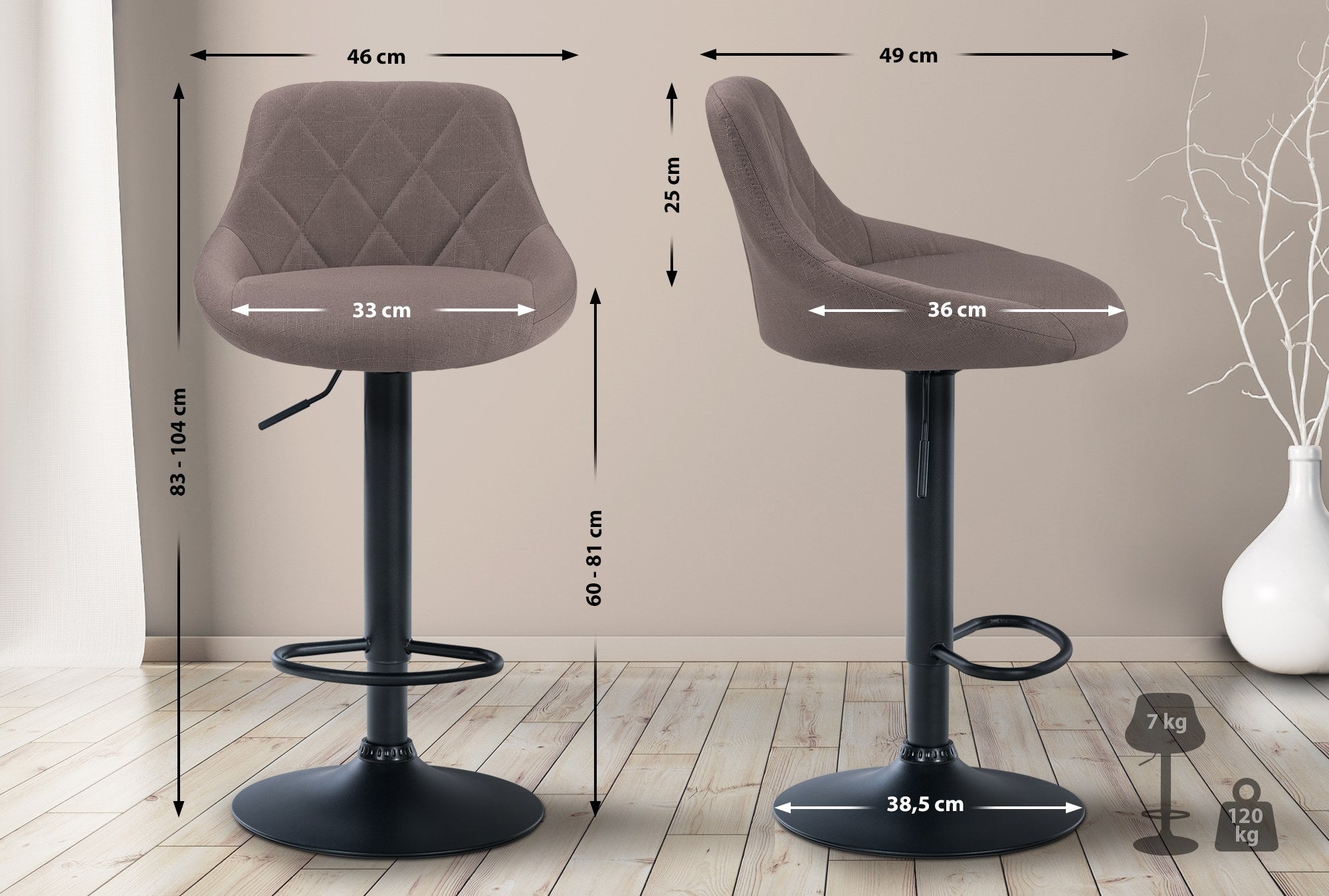 Tabouret de bar x1 pivotant hauteur réglable en tissu taupe surpiqûres décoratives cadre en métal noir 10_0005707