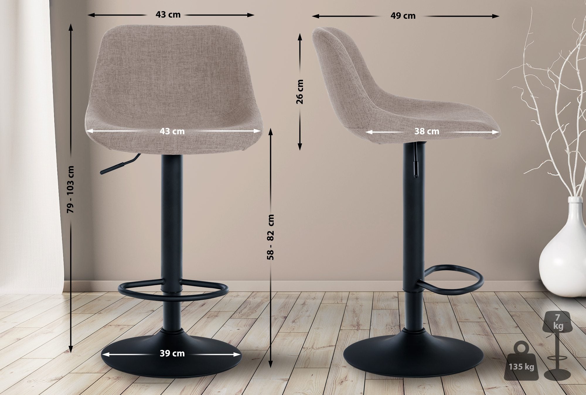 Tabouret de bar x1 rotation à 360°en tissu taupe pieds en trompette métal noir 10_0006077