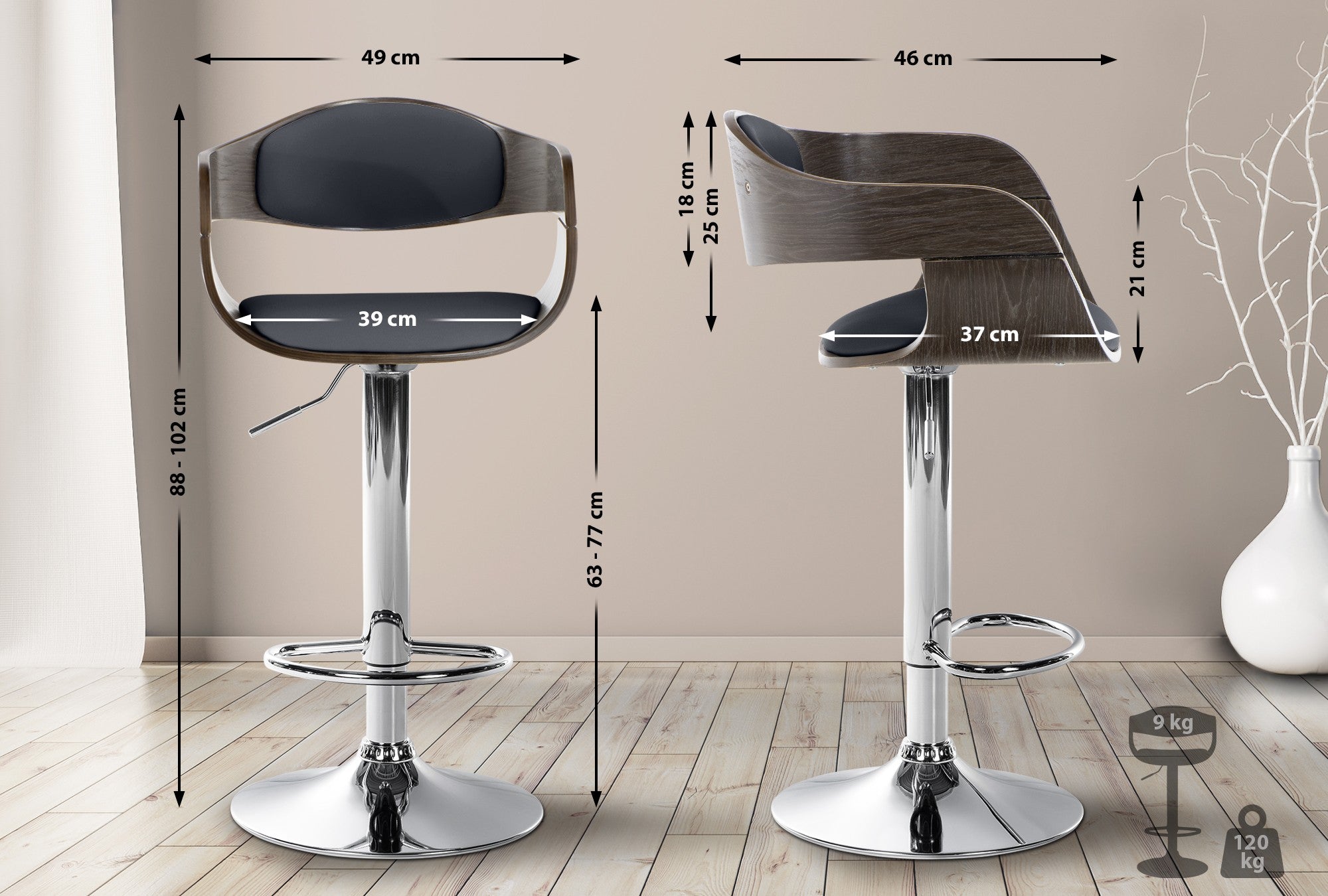 Hauteur de l'assise: 63 -77 cm