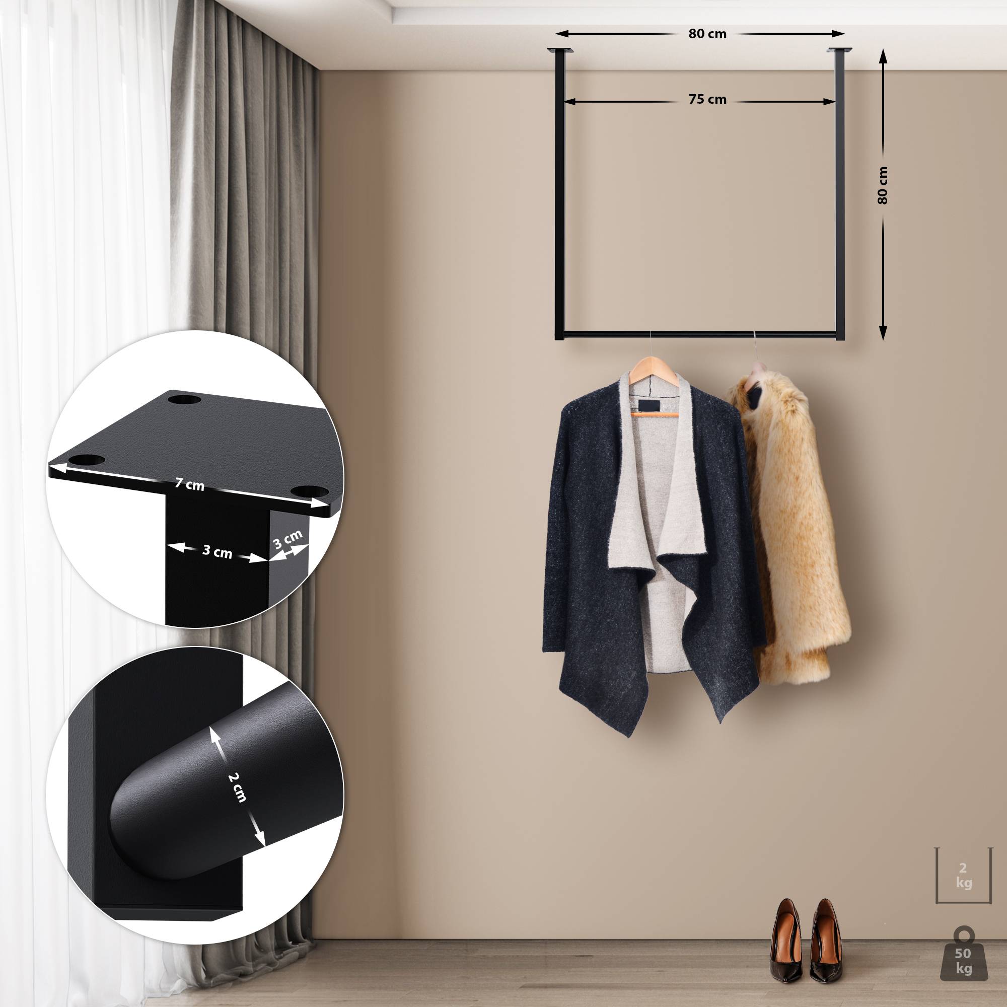Tringle à vêtements suspendue porte-manteau 80x80 cm acier thermolaqué noir 10_0008983