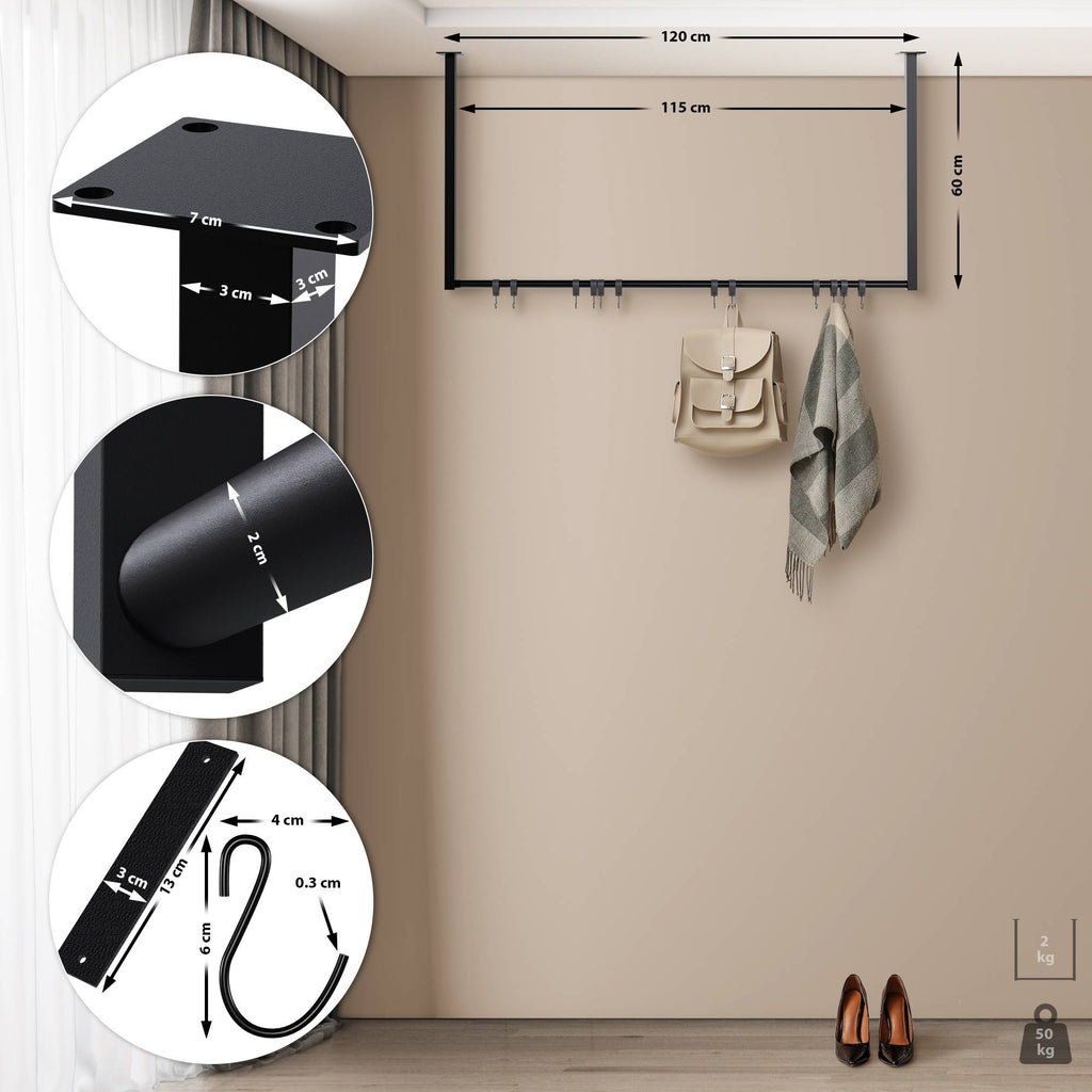 Tringle à vêtements suspendue porte-manteau avec 12 patères 120x60 cm acier thermolaqué noir 10_0009013