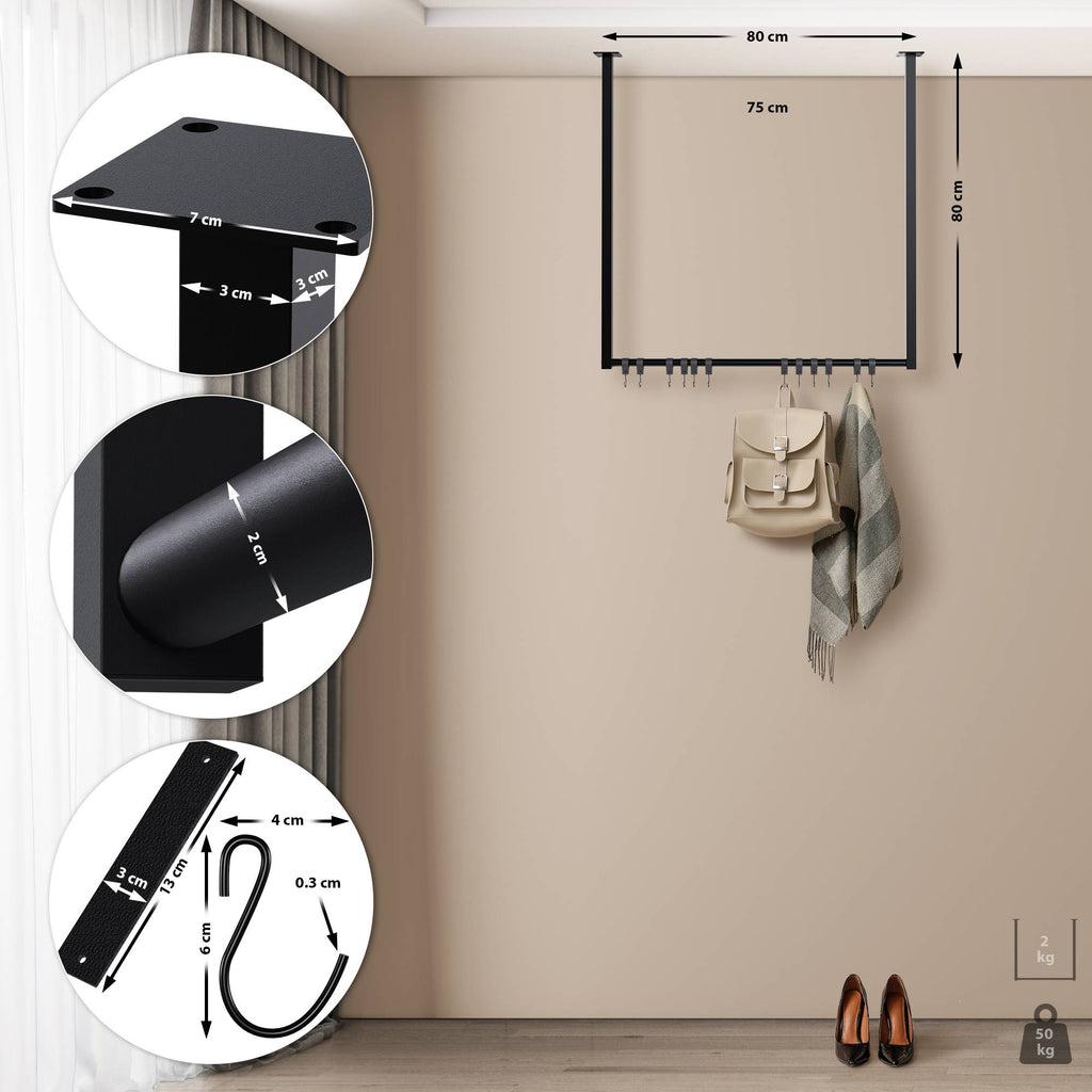 Tringle à vêtements suspendue porte-manteau avec 12 patères 80x80 cm acier thermolaqué noir 10_0009019