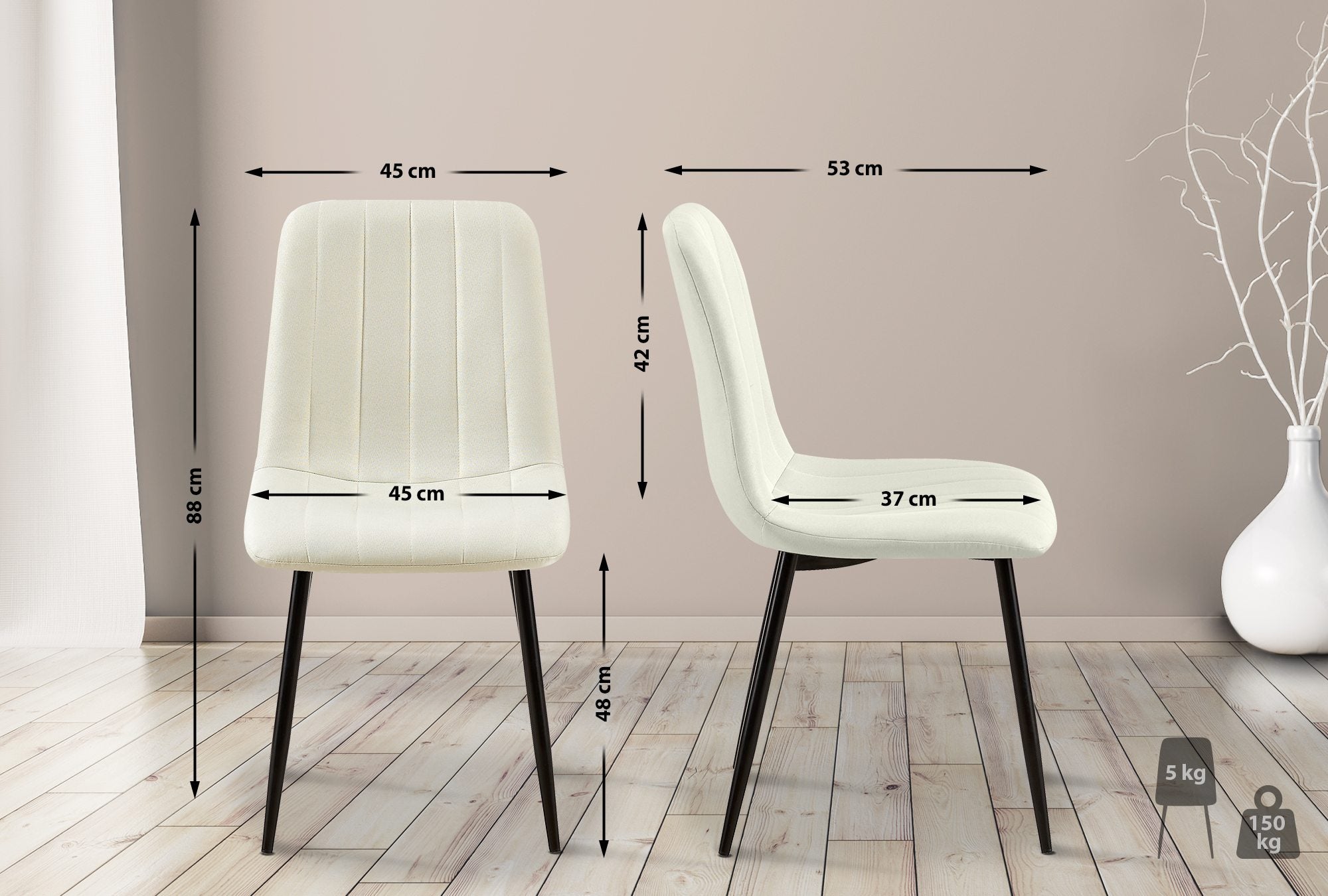 Chaise de salle à manger x1 coutures décoratives verticales assise en tissu crème pieds en métal noir 10_0002211