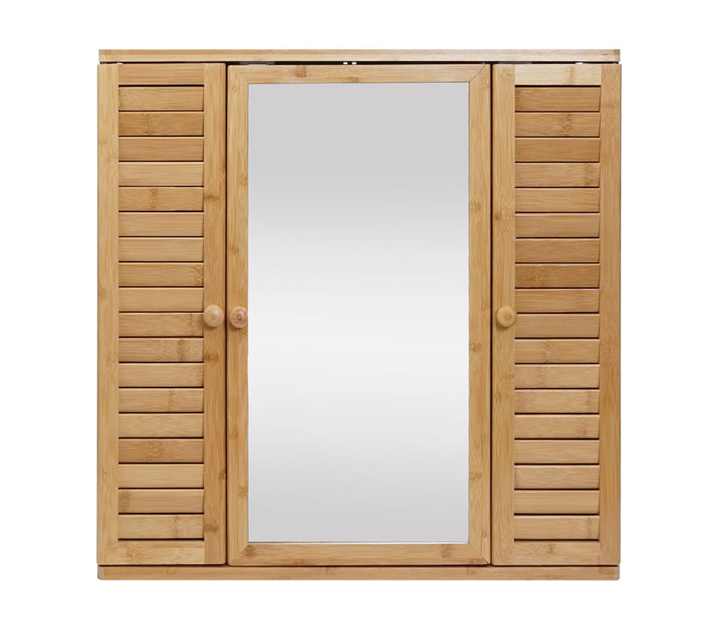 Armoire meuble mural de salle de bain avec miroir 3 étagères 3 portes en bambou 60x60x15 cm 04_0005765