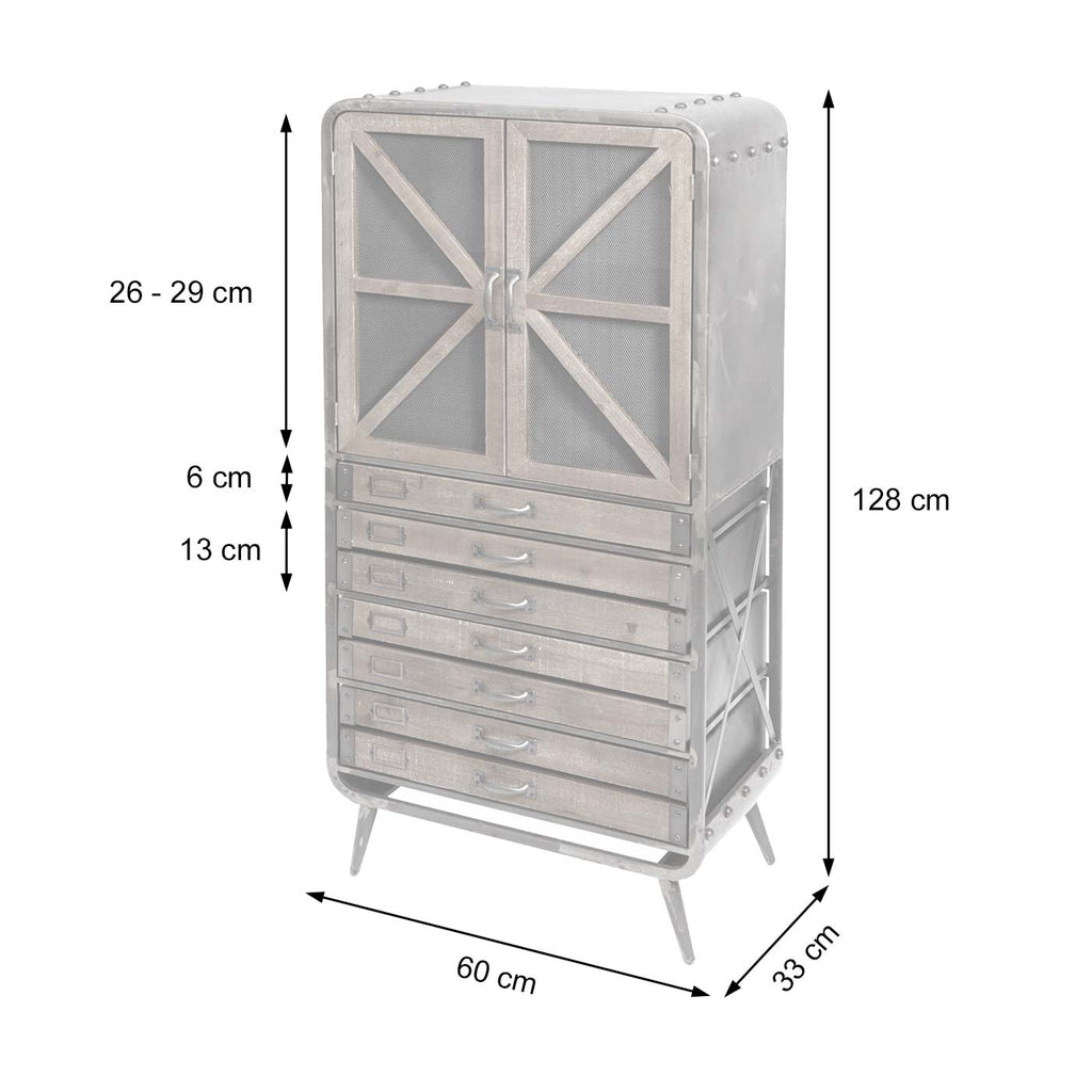 Ce meuble au look industriel est non seulement attrayant visuellement, mais dispose également de beaucoup d'espace de rangement. Dispose de quatre tiroirs, qui semblent sept de l'extérieur, ainsi que de deux espaces de rangement pratiques pour des possibilités de rangement optimales