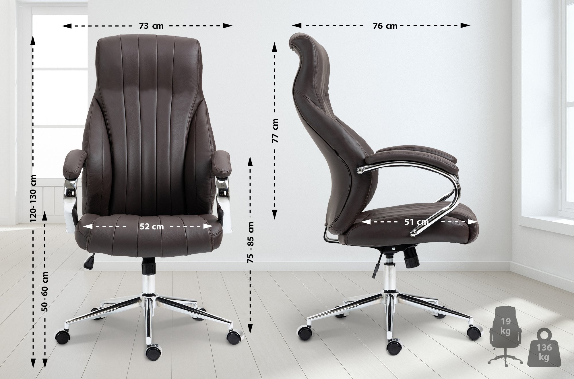 Cette chaise de bureau exclusive impressionne non seulement par son look moderne, mais aussi par son confort inégalé. Son revêtement de haute qualité garantit une assise confortable pendant des heures. L'assise et le dossier sont en cuir de vachette de haute qualité. Le dossier présente une forme en S confortable et la hauteur d'assise est réglable en continu, garantissant une assise ergonomique. De plus, la chaise de bureau est équipée d'un mécanisme à bascule offrant une plus grande liberté de mouvement. La stabilité est assurée par le cadre en métal chromé. Les cinq roulettes souples lui permettent de rouler facilement et sans effort sur le sol, que ce soit sur sol dur ou moquette.