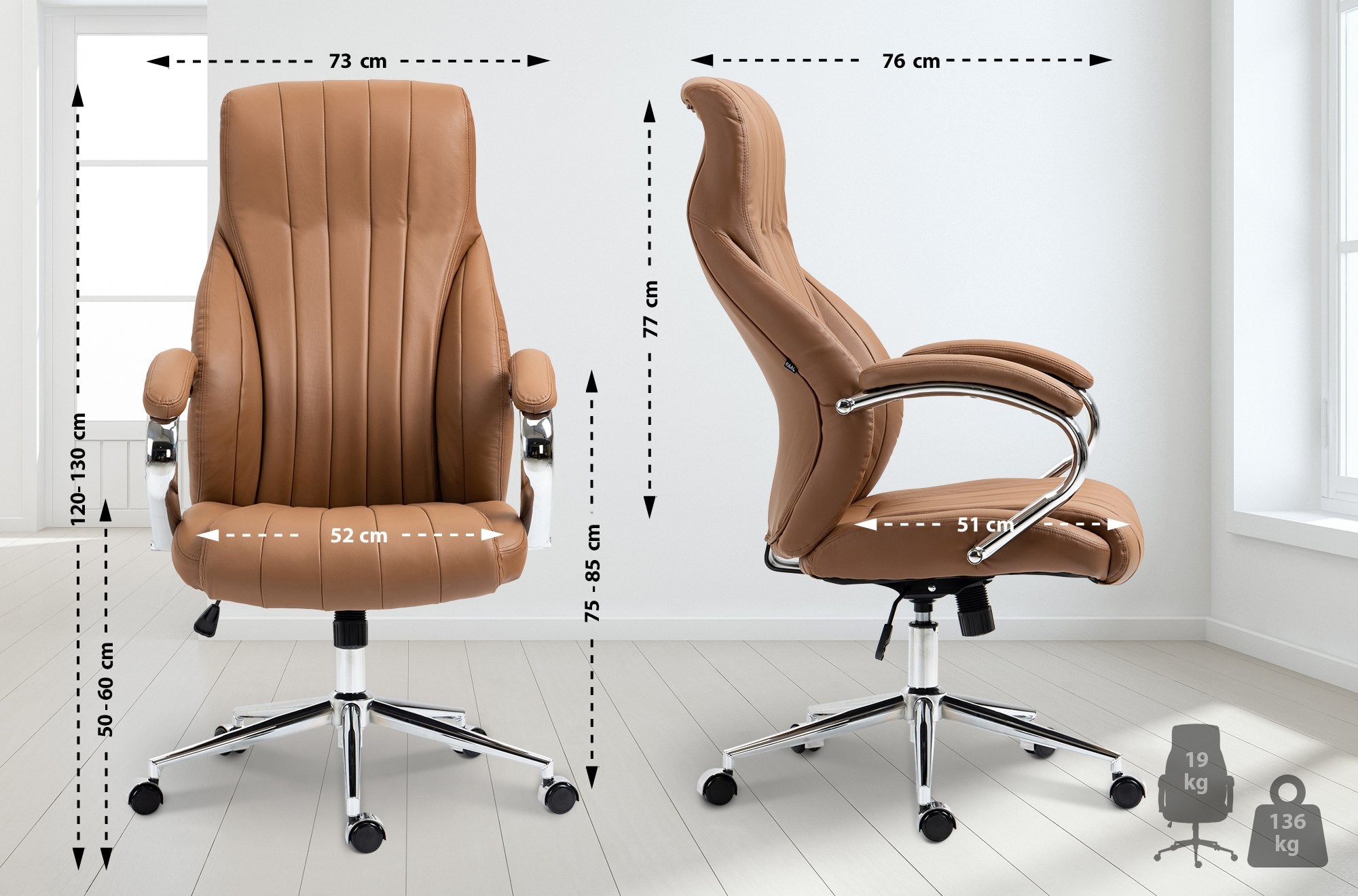 Cette chaise de bureau exclusive impressionne non seulement par son look moderne, mais aussi par son confort inégalé. Son revêtement de haute qualité garantit une assise confortable pendant des heures. L'assise et le dossier sont en cuir de vachette de haute qualité. Le dossier présente une forme en S confortable et la hauteur d'assise est réglable en continu, garantissant une assise ergonomique. De plus, la chaise de bureau est équipée d'un mécanisme à bascule offrant une plus grande liberté de mouvement. La stabilité est assurée par le cadre en métal chromé. Les cinq roulettes souples lui permettent de rouler facilement et sans effort sur le sol, que ce soit sur sol dur ou moquette.