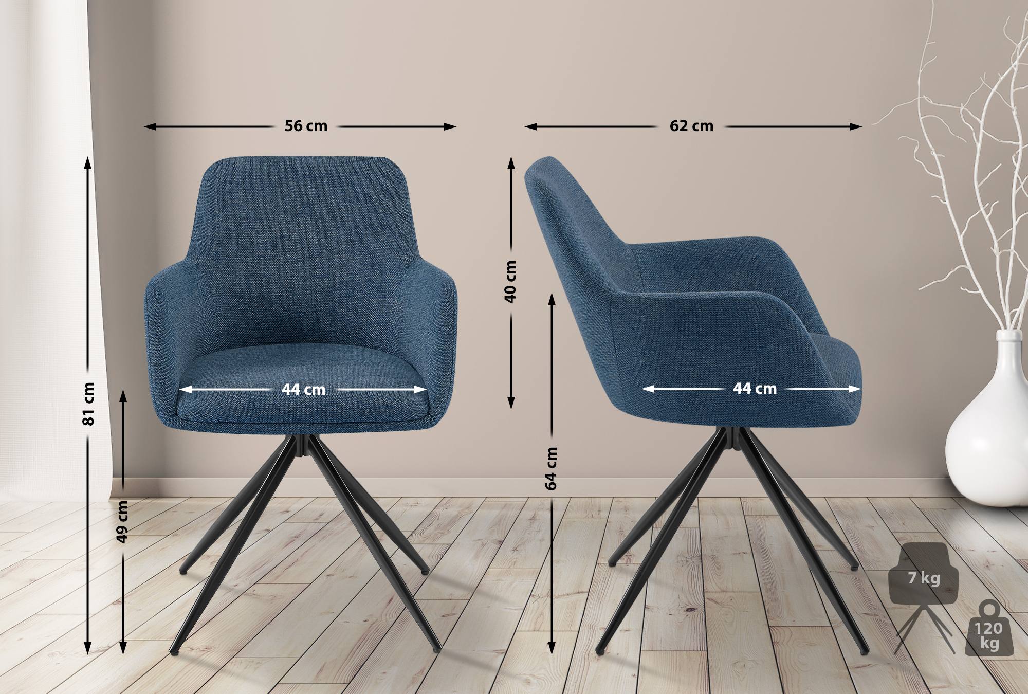 Chaise de salle à manger x1 pivotante rembourrée avec accoudoirs en tissu bleu cadre métal 10_0007357