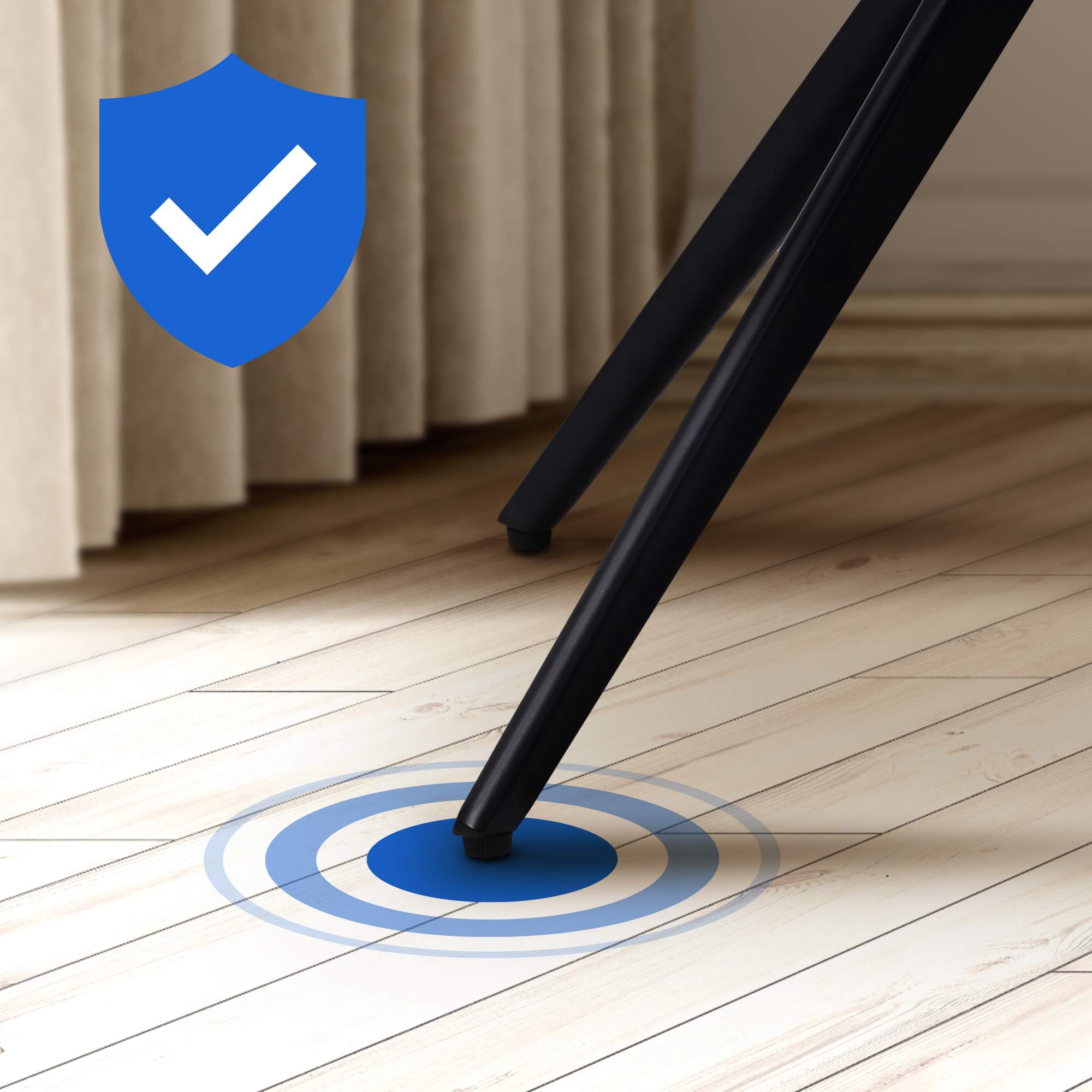 La base de cette chaise de cuisine est un cadre à quatre pieds noir mat en métal thermolaqué. Ainsi, la chaise de salle à manger peut supporter en toute sécurité une charge allant jusqu'à 120 kilogrammes. Les protections de sol empêchent les sols sensibles d'être endommagés.