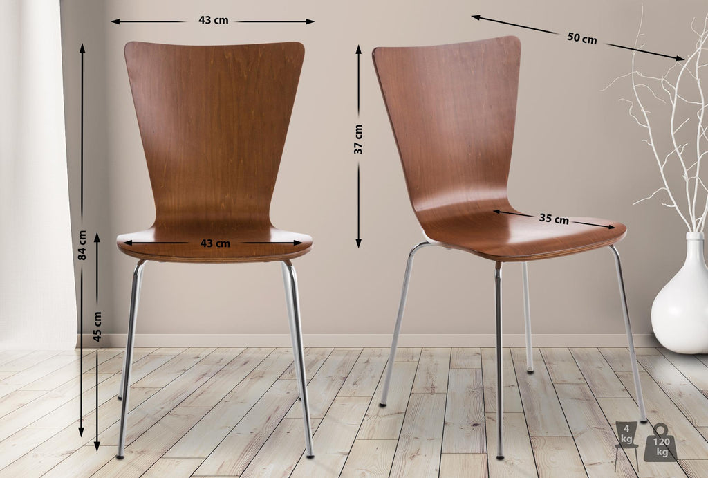 La chaise de cuisine allie design intemporel et fonctionnalité pratique. La hauteur totale de 84 cm et une hauteur d'assise de 45 cm assurent un confort d'assise optimal. L'assise en bois robuste et la structure en métal d'aspect chromé brillant offrent une combinaison d'élégance et de stabilité. La fonction empilable fait de la chaise un véritable gain de place, tandis que les protections de sol incluses protègent le sol. Que ce soit pour le bureau, la salle de conférence ou l'événementiel, la chaise s'adapte à chaque situation.