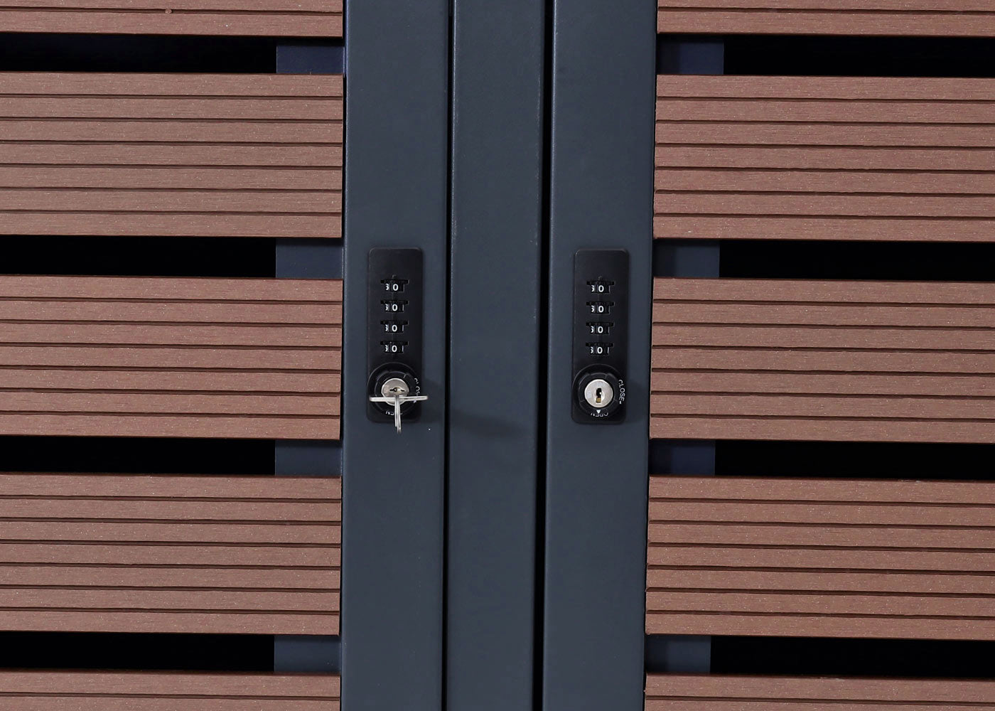 Les portes peuvent être verrouillées séparément : elles disposent d'une serrure à combinaison réglable individuellement avec un code de sécurité à 4 chiffres. Grâce aux trous de drainage, l'excès d'eau peut s'écouler du bac à plantes.