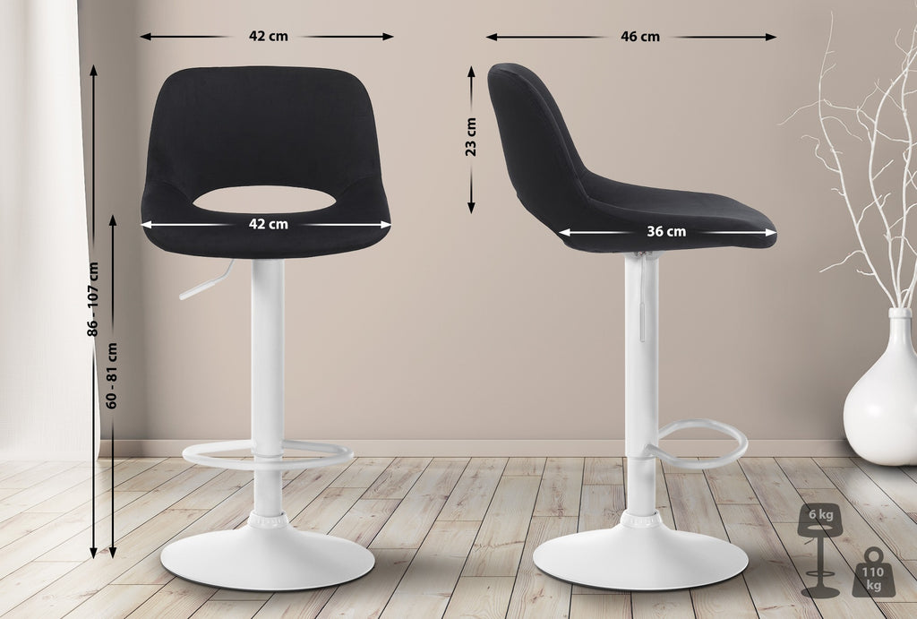 Tabouret de bar chaise haute x1 avec repose-pieds en velours noir piètement métallique blanc 10_0004610