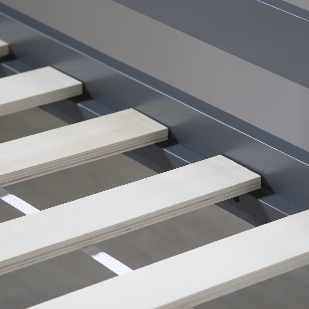 Lit mezzanine avec sommier à lattes, tobbogan, tunnel et rideau gris avec étoile