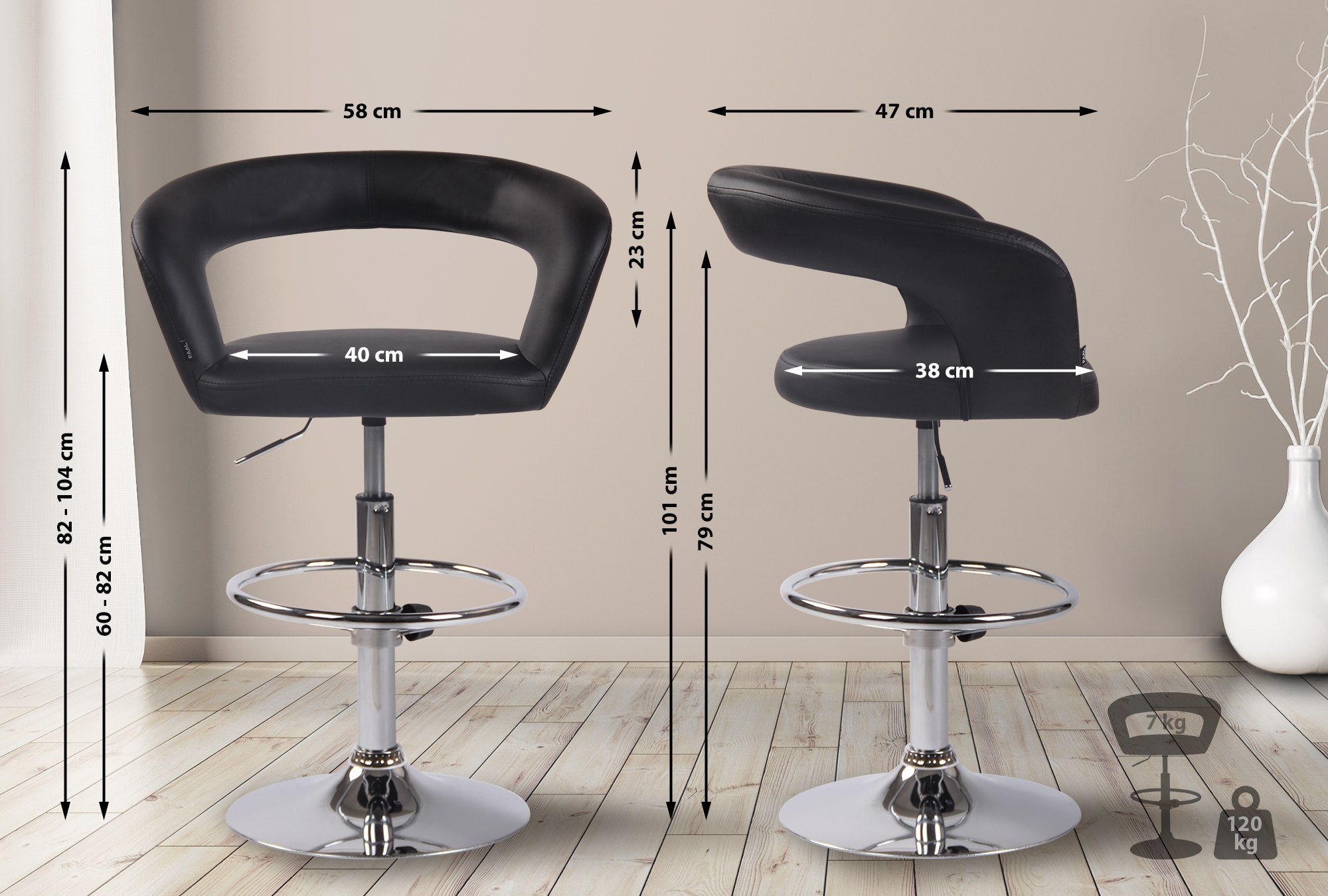 Hauteur de l'assise: 60 - 82 cm