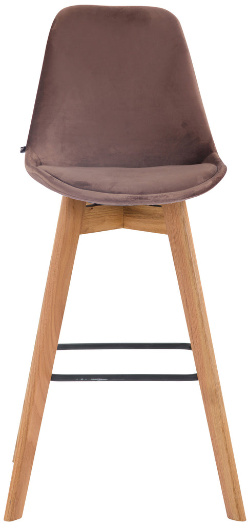 Le tabouret de bar est doté d'une coque d'assise rembourrée en mousse froide indéformable, recouverte de velours. Son cadre à 4 pieds en chêne lui confère une grande stabilité. Les traverses métalliques servent de repose-pieds, garantissant une assise confortable, même pendant des heures.