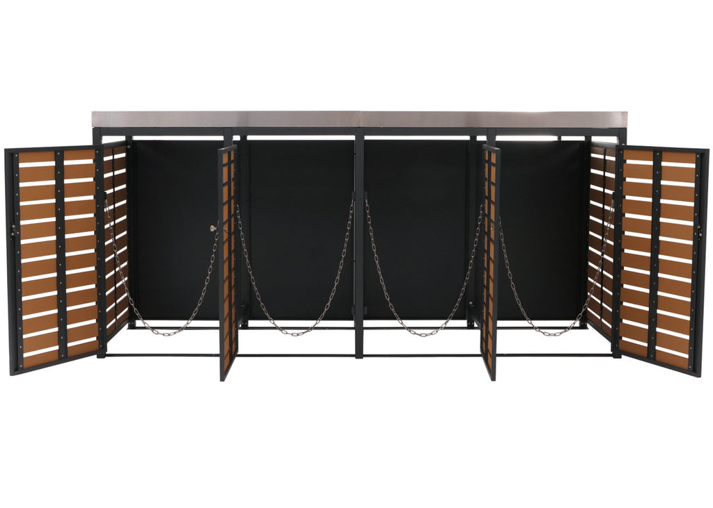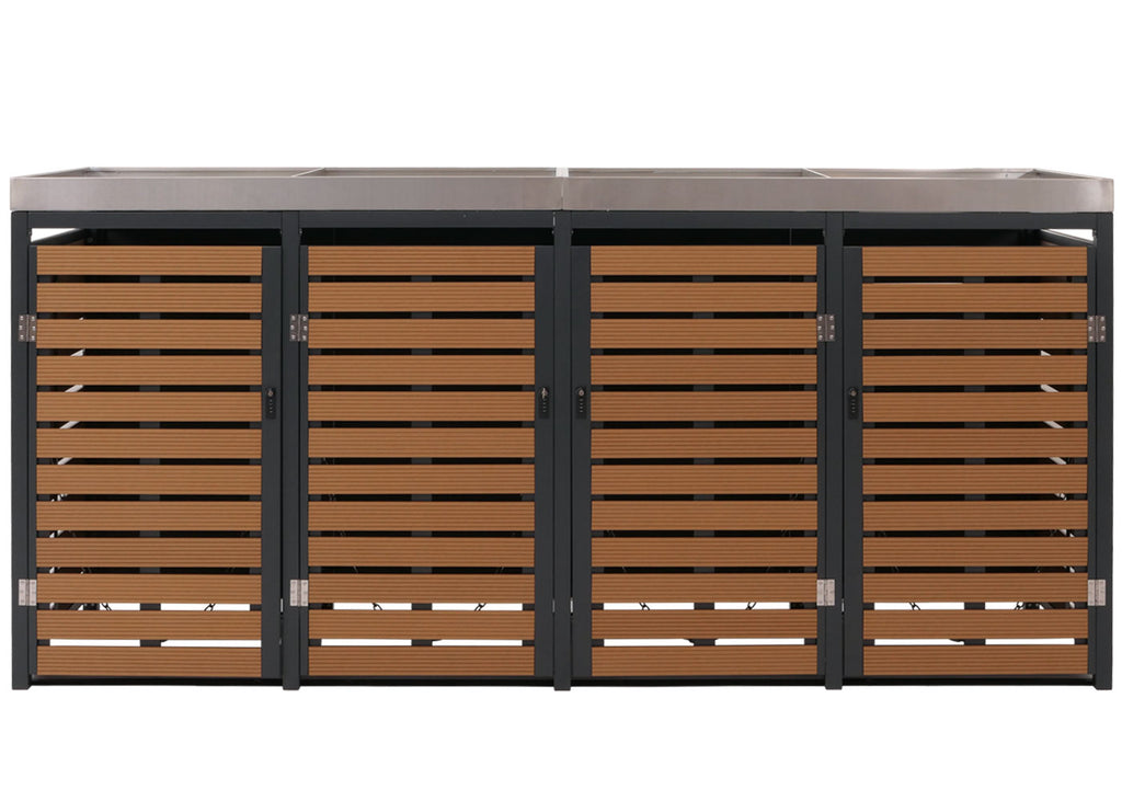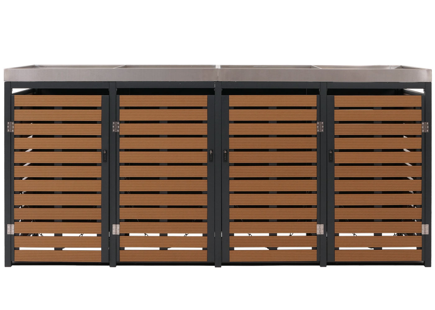 Abris poubelles 4 compartiments avec bac à plantes 124 x 265 x 84 cm WPC acier inoxydable et acier galvanisé aspect teck 04_0007559