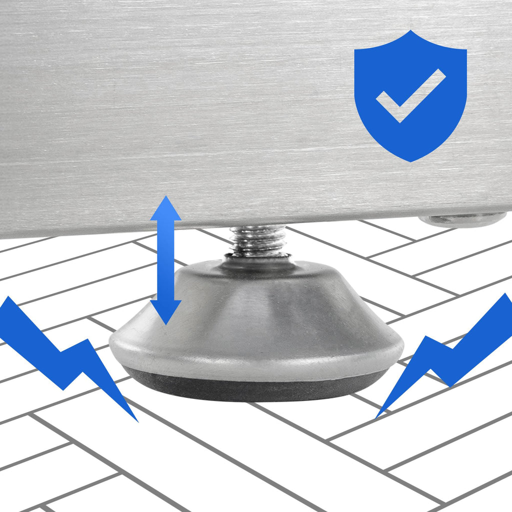 Grâce aux entretoises latérales, les bûches sont maintenues en place, tout en leur permettant d'être stockées à l'air libre, loin des moisissures. Le support est doté de protecteurs de sol intégrés aux pieds réglables en hauteur. Ces derniers peuvent être ajustés pour corriger d'éventuelles irrégularités au niveau des sols.
