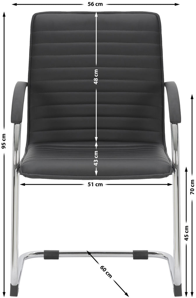 Ces chaises à piétement luge sont recouvertes de similicuir et leur structure métallique. L'assise ainsi que les accoudoirs sont rembourrés. Le piètement dispose de quatre protections de sol qui empêchent de rayer le sol. Les chaises s'adaptent à la plupart des intérieurs et des locaux. Non seulement dans le salon ou le bureau, mais aussi dans les salles d'attente et les salles de travail, ces chaises pivotantes conviennent parfaitement.
