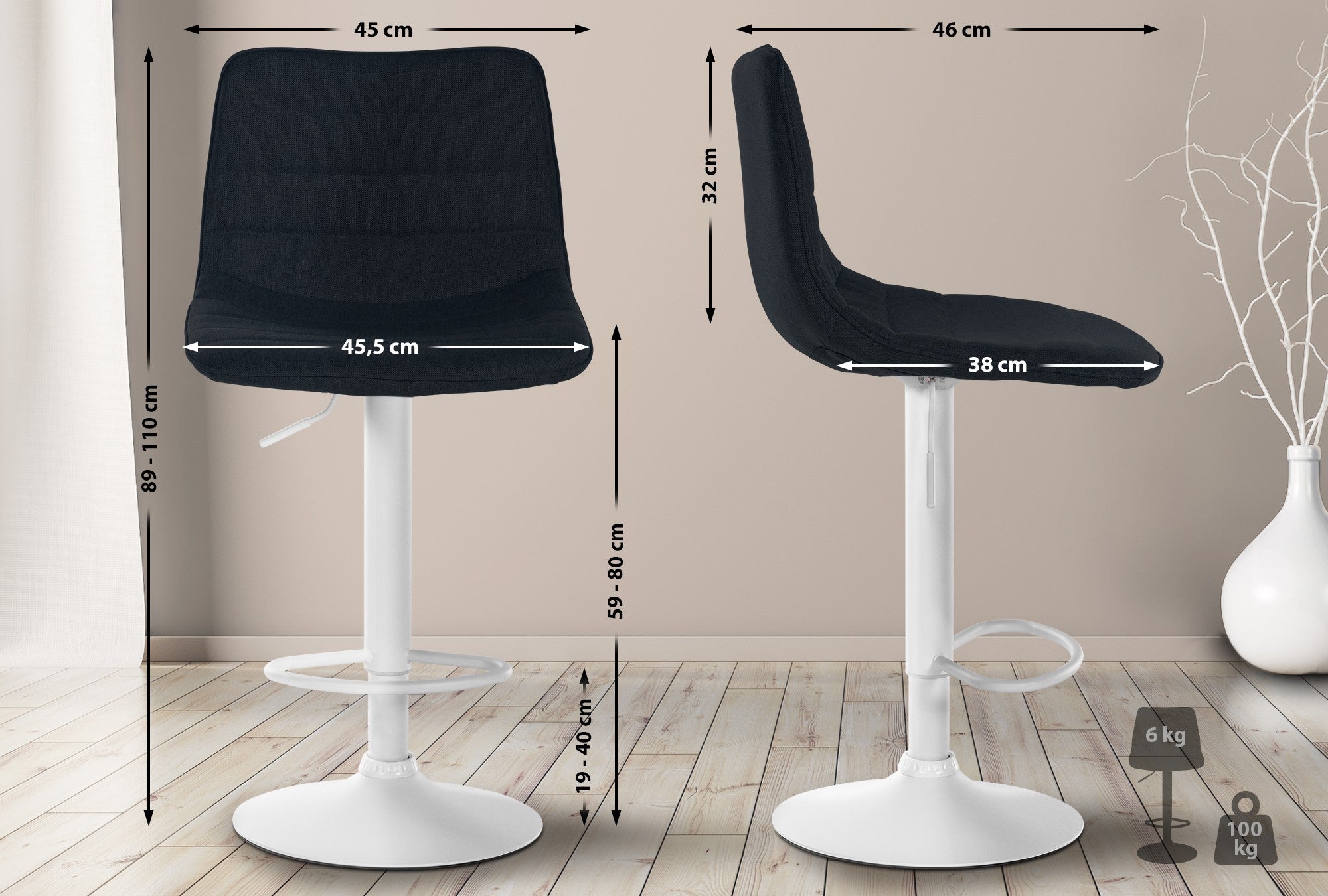 Lot de 2 tabourets de bar chaises hautes avec repose-pieds incurvé en tissu noir structure métallique blanc 10_0004319