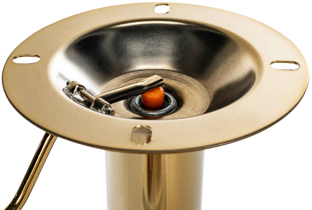 La structure est en métal robuste et possède une large base en forme de trompette qui assure un maintien sûr. Un repose-pieds intégré facilite la position assise. La hauteur d'assise est réglable en continu de 63 cm à 83 cm grâce à un système de vérin à gaz, ce qui permet au tabouret de s'adapter à différentes hauteurs de comptoir. L'assise est pivotante à 360°, pour une flexibilité accrue.