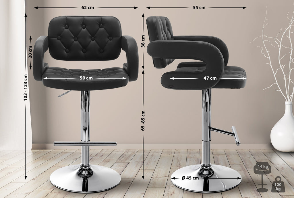 Grâce à la manette qui se situe sous l'assise, la hauteur du tabouret de bar est réglable en continu, il est alors ajustable à toutes les hauteurs de comptoir ou ajustable à la taille de celui qui l’occupe.