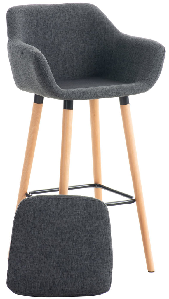 La fermeture intégrée dans le revêtement du coussin permet de l'enlever aisément pour le lavage en cas de besoin. La chaise de bar repose sur 4 pieds en bois, soutenus par une structure en métal pour plus de stabilité et qui sert également de repose-pied.