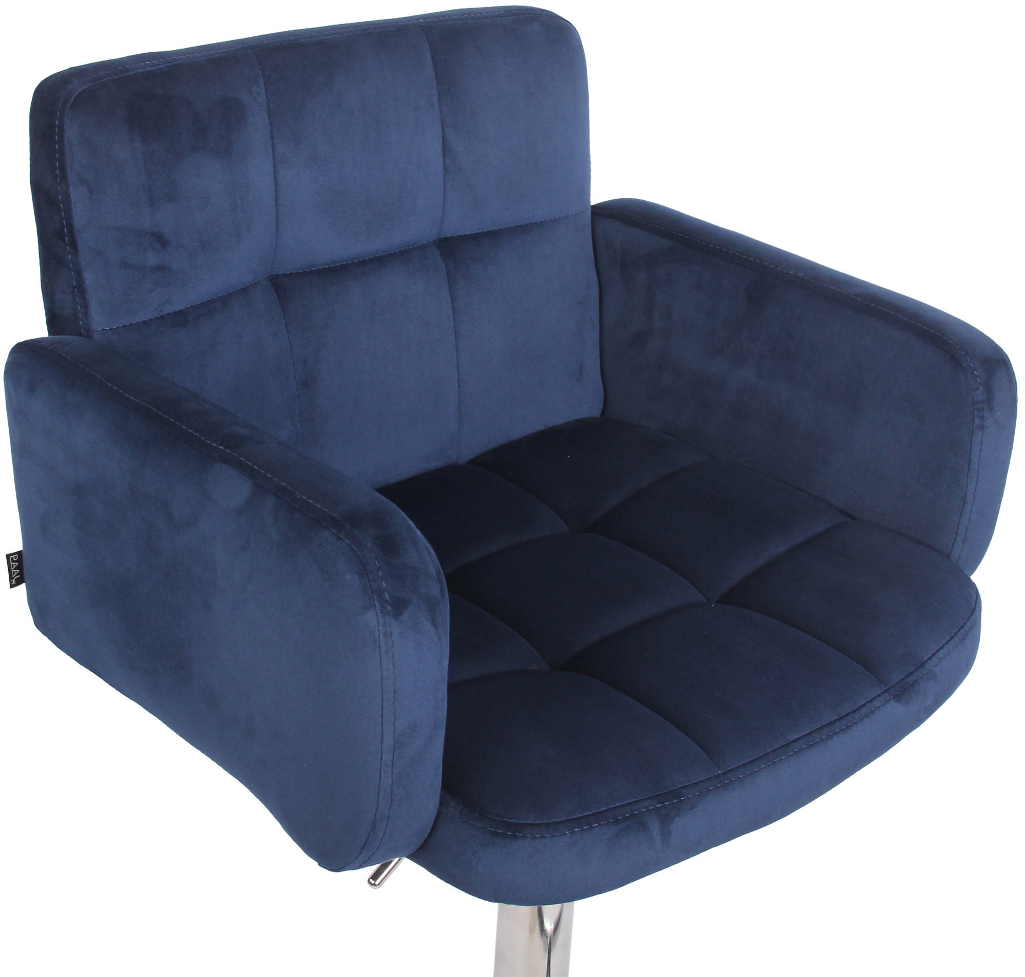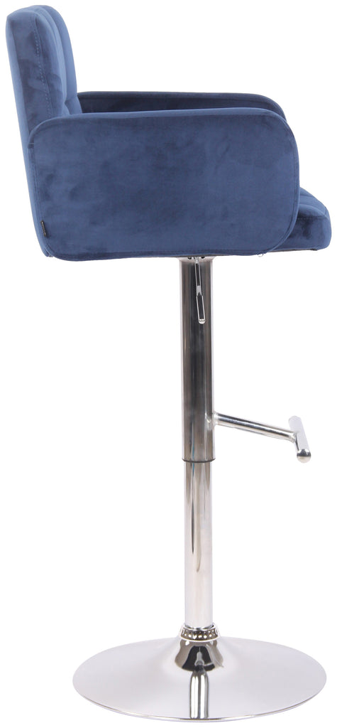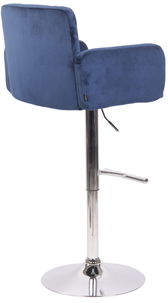 Tabouret de bar pivotant en velours bleu et métal chromé avec accoudoirs repose-pieds et dossier TDB10648